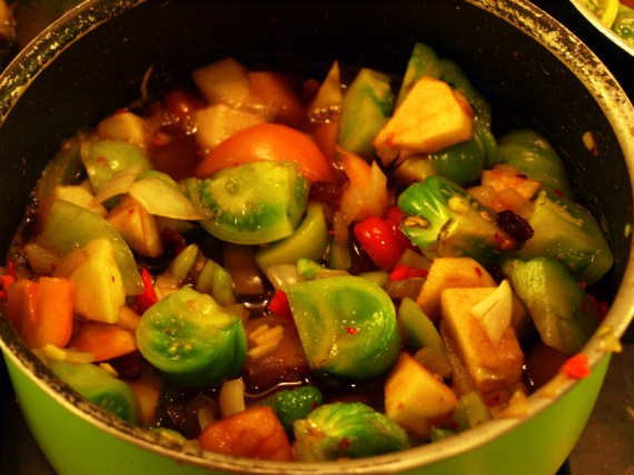 Chop all of the ingredients according to whether you want to be able to spread the chutney onto an oatcake or if you prefer to eat it with a knife and fork (ours verged towards this end the scale). Bring to the boil in a huge pot or many small ones for 1/2 hour to one hour depending on pot size and what kind of consistency you want (thick and juicy, ideally – boil off most of the liquid). Wash jam jars and lids and then sterilise in a hot oven. Fill with chutney, screw on the lids. They will seal themselves as the chutney cools.