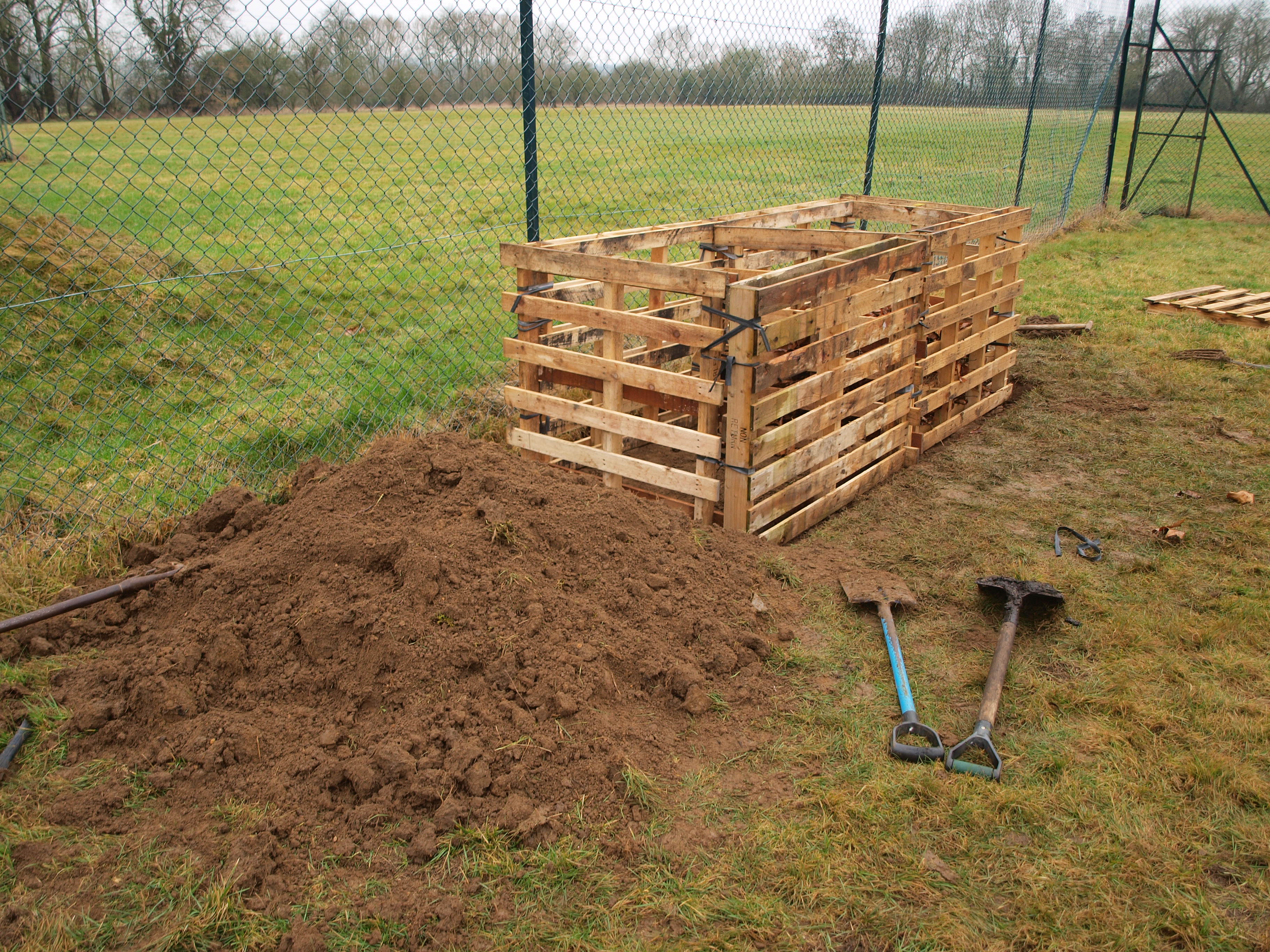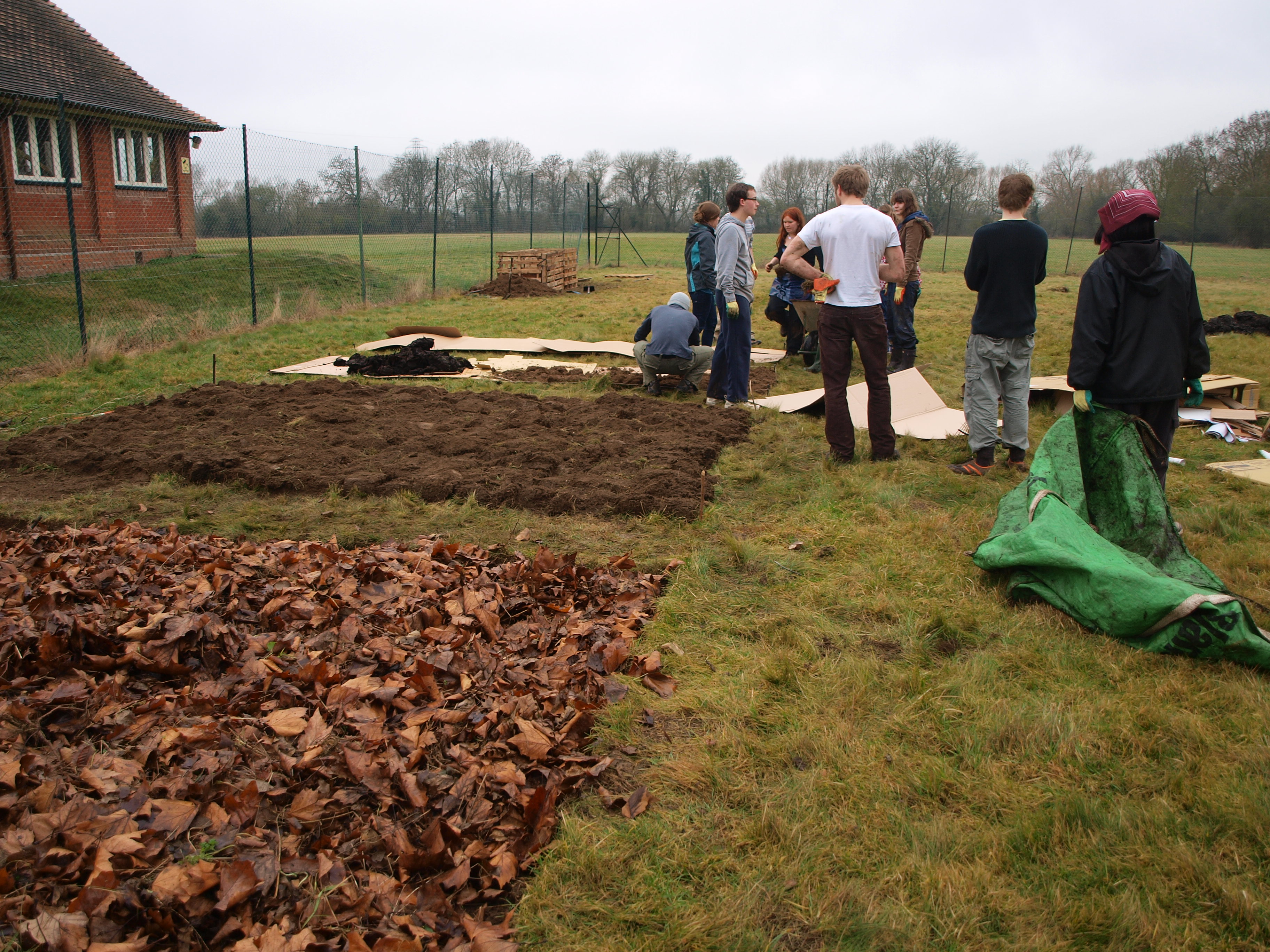 – We also set up two ‘no-dig’ beds, using a technique called “sheet mulching” that is very popular with permaculturalists. This time the beds were about 4’ wide, to allow anyone to reach the middle without having to walk on the bed, and the same length as the beds above. After marking the beds out, we laid cardboard (collected from recycling bins, with any plastic bits, sellotape, staples etc removed) directly onto the turf, and then placed dropped leaves, grass clippings-sludge and some soil removed in making the composters (see below) on top of the cardboard. The cardboard and grass below will rot down, and with some help from the many worms we found, all the organic matter we placed on top will get mixed in to leave a lovely, well-structured, fertile soil for us to plant into later in the season… Without having had to stick a single fork into the soil!