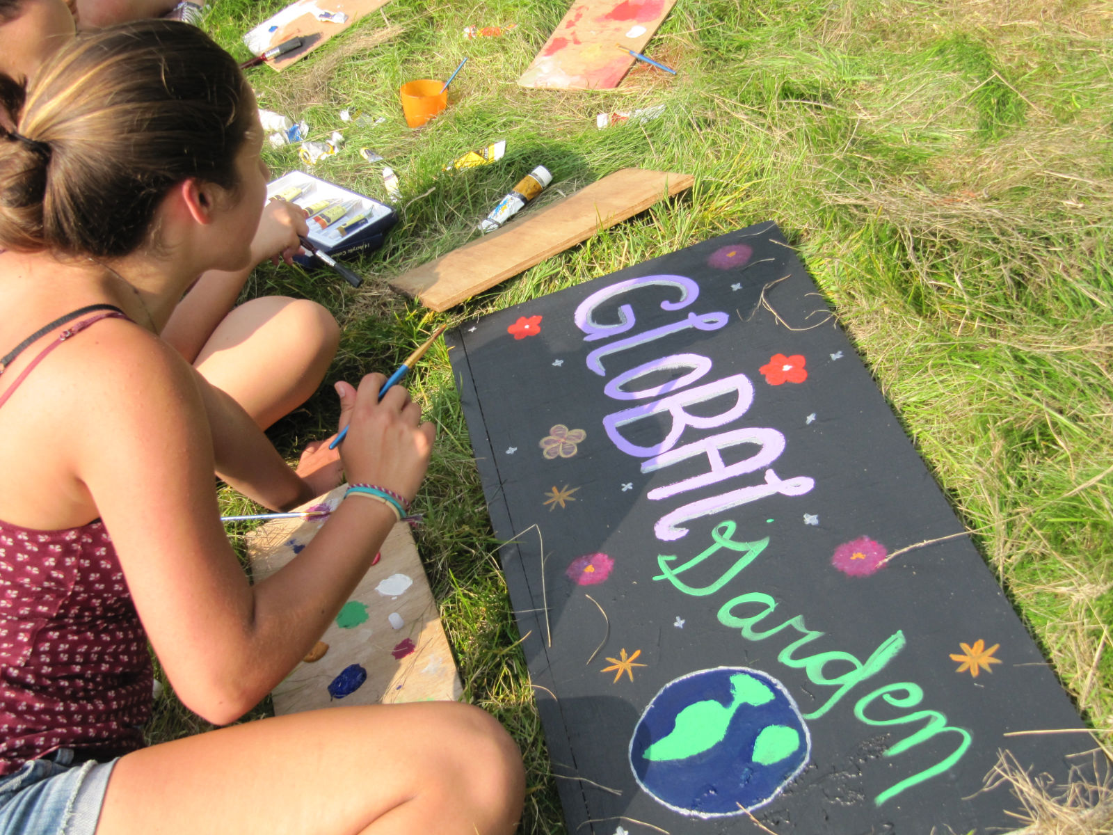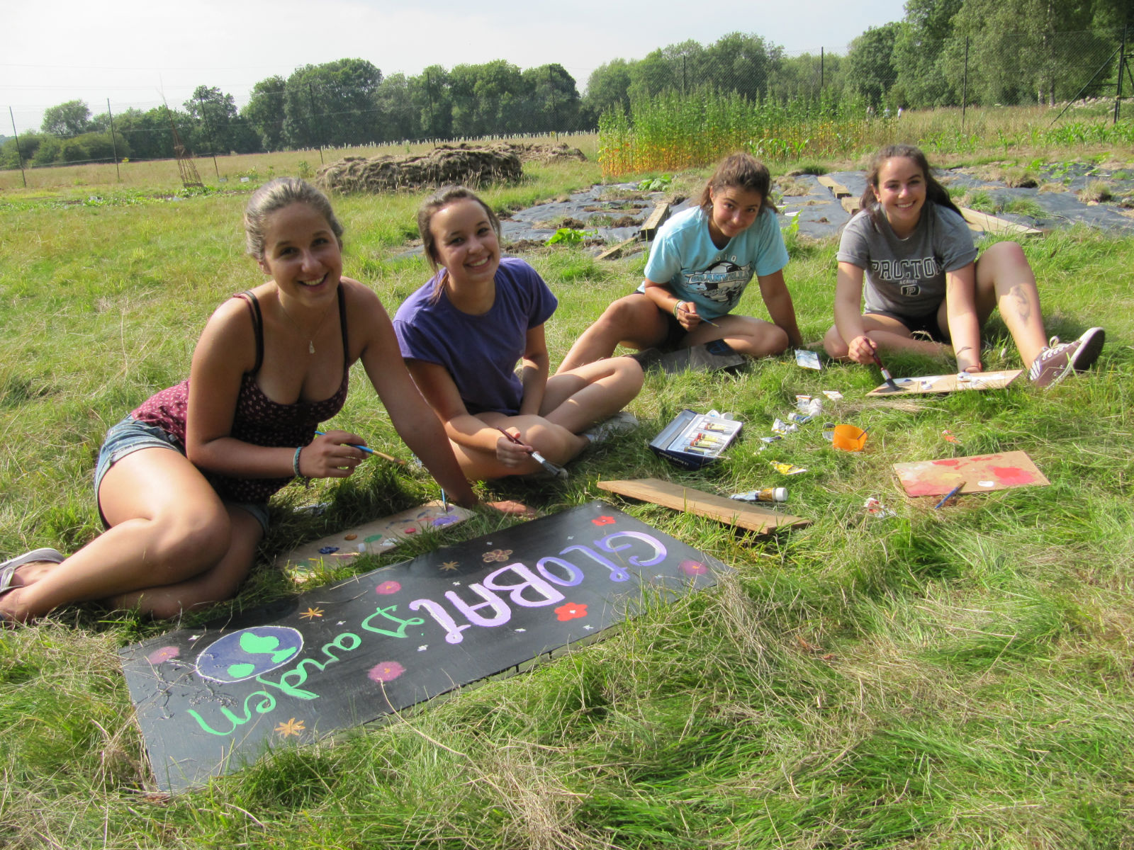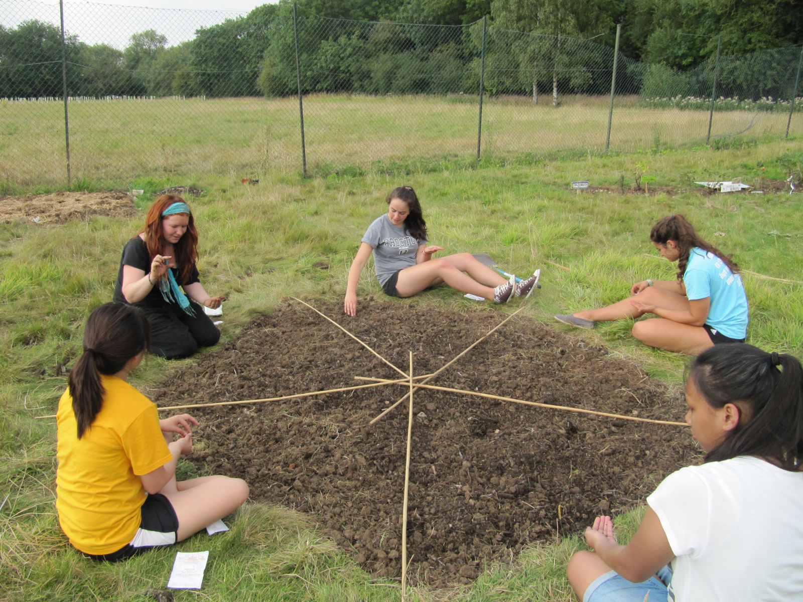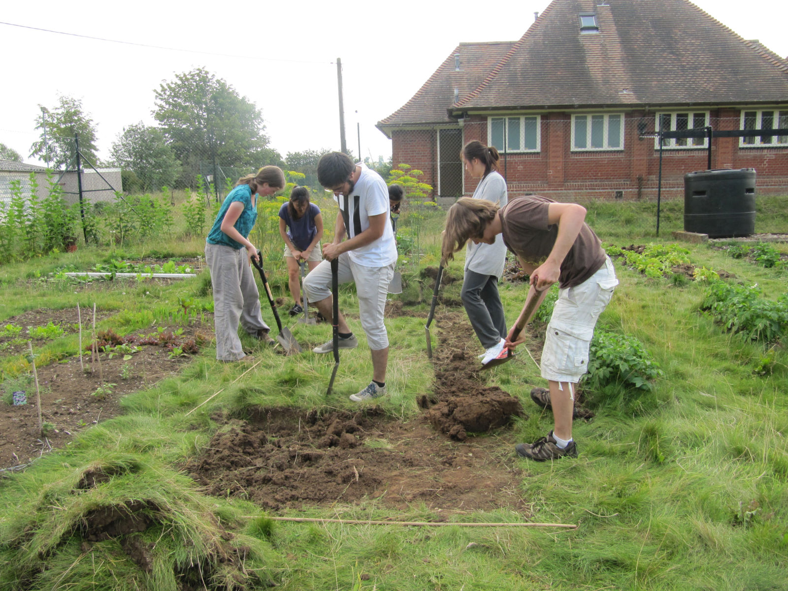 On July 28th, 20 international students who are attending summer classes with Oxford Tradition, part of the Oxbridge Academic Programs, came down to the garden for an afternoon of work. The sun was shining and we had to be careful to keep ourselves hydrated, but we had a wonderful – and wonderfully productive -afternoon: digging a new bed, designing and creating three triangle no-dig beds, planting our “self-seeding pentagon” garden, painting beautiful signs, tidying existing beds, weeding the squash and melons, weeding the strawberries and beans, (eating the strawberries and peas!), weeding the tomatoes, pruning the tomatoes, fetching compost, watering, harvesting peas, staining the bench, fixing the fence, you name it!  Big thanks to everyone who came out, to the facilitators, and  to the photographers.  It was great fun to trade gardening tips from different countries and dream of the different plants we’d like to try growing – kiwi, anyone?  Hopefully the afternoon sowed the seeds for new edible community gardens in towns around the world!  Thanks again, students. Keep in touch, and come on down to Oxgrow when you’re next in town. – Rosanna