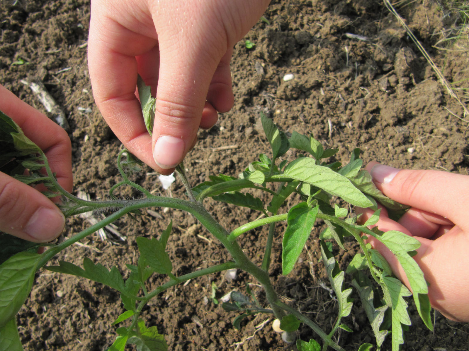 How to prune a tomato: pluck off the shoot that grows between the leaf and the stem. As demonstrated.