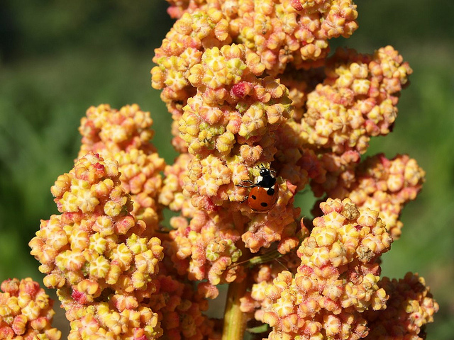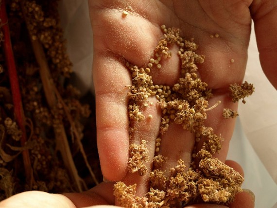 First, the basics. It’s pronounced keen-wah. Some people will claim it is keen-o-ah… I think they’re wrong, but we won’t get hung up on technicalities! It’s a new world crop, first domesticated in the Andes 3-4,000 years ago. Although in culinary terms it occupies the same niche as rice, bulgar wheat and couscous, it’s actually not a true cereal grain but a goosefoot, more closely related to spinach, tumbleweed and the common (edible) weed fat hen. When the conquistadores arrived in quinoa-country, they tried to persuade the Inca people to give up on such ‘Indian food’ and grow wheat instead, a cereal vs. pseudocereal battle that is still raging in the Andes today, although in different form. Nonetheless ‘the mother of all grains’, as it was known, survived and is still widely cultivated in Peru and Bolivia. Not for no reason is quinoa beloved in South America. In particular, it has a much higher protein content than other staples of the region like rice or corn (18% compared to 7% or 3% respectively). And unlike other staples its protein component features a balanced range of amino acids, making it a good replacement for meat proteins in a vegetarian diet. It is high in fibre, phosphorous, magnesium and iron, and it is gluten-free. Not only the quinoa grain itself but also the leaves can be eaten (we didn’t know this when we harvested, but we’ll save some for a quinoa leaf soup next year), and if the grains are germinated by leaving for a few days in cold water, their nutritional properties are magically multiplied as enzymes become active.