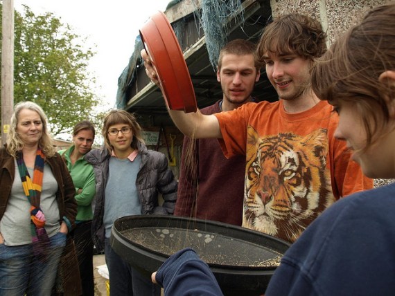 Quinoa also comes with its own natural defence against predators – it is naturally imbued with bitter-tasting saponins that prevent birds and beasts from feasting on the plants. Brilliant… but it does add one extra stage to the already long processing that the crop requires before it can be eaten. Good thing we love labour intensive crops! We started off by cutting the stems and leaving to dry inside for a few weeks. Then to extract the grains, a team of volunteers downed shovels and took up a meditative pace of work, rubbing the plant heads through their fingers to leave a mix of grains, chaff and dust. Many methods were piloted to separate out the pure grains from this mixture, including shaking and sieving, but in the end good old-fashioned winnowing in the wind was the only thing that did the trick, letting the lighter chaff fly off into Oxfordshire whilst (hopefully) catching the grains below. From this stage the saponins must be removed by soaking several times before cooking. (Industrially-processed quinoa is often ‘polished’ rather than soaked, literally rubbing off the outer layer of saponins and reducing its nutritional value). Advice from experienced quinoa farmers and chefs much appreciated on how to improve our process! Next on the agenda is cooking it up for our Harvest Festival this Sunday. When boiled, the disk-shaped seeds – which resemble flattened couscous grains – unfurl their crunchy tail-like ‘germ’ and can easily be mistaken for tadpoles. Recipes coming soon.. any good ideas?