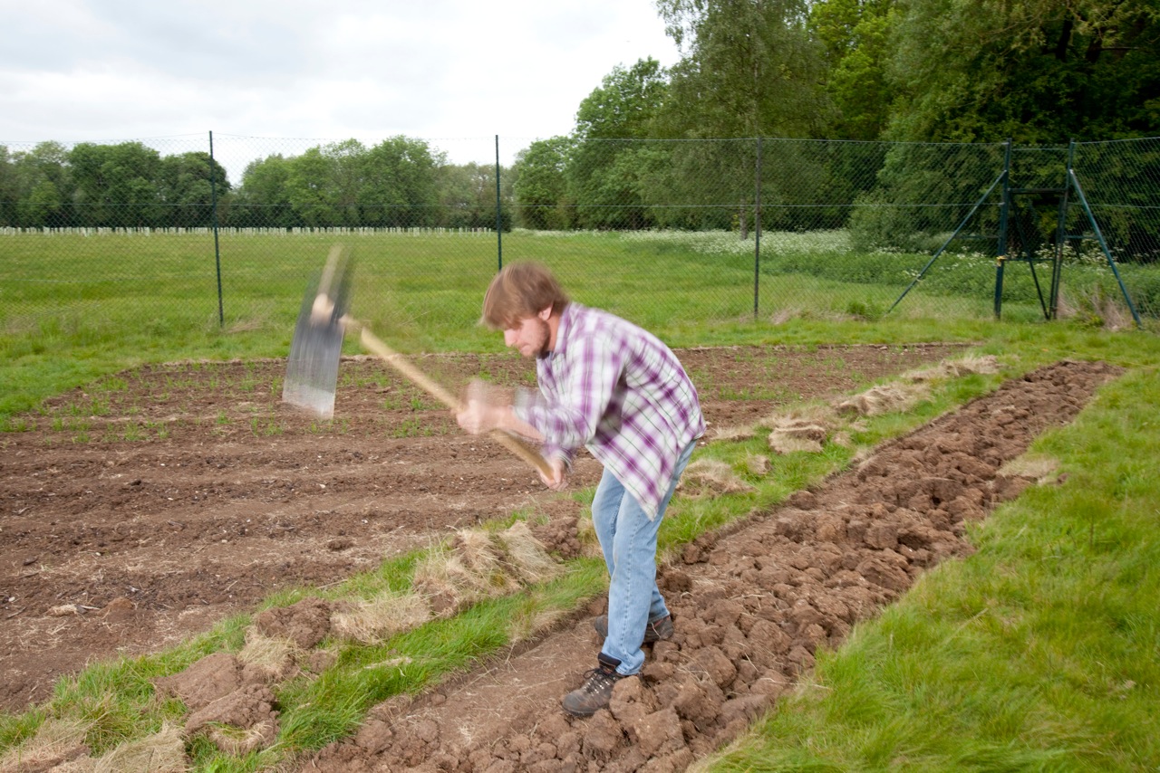 The latest gifts to come our way are three beautiful hand-made tools, made by the lovely Simon from Get Digging. His self-proclaimed mission is to get people digging, “faster, easier, and with a lot less backache”. Even the no-dig aficionados amongst us know that sometimes you’ve just gotta dig… Simon has scoured the world for gardeners and farmers whose tools are more intuitive to use than our lowly homegrown spades and forks. Here’s a pic of Joe trying out our new “azada”, which uses gravity from the angled swinging movement more than brute human strength to slice through the turf: