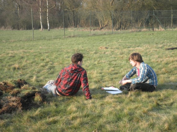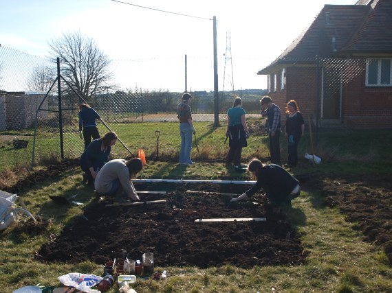 While a small but dedicated team continued scraping back grass patches for our not so wild wildflower meadow (see last week’s posting), some serious geometry was taking place in the far corner of the site to create the groundplan for a small field of wheat that will be planted in the next couple of weeks.  With the studied use of string and pegs and some judicious eyeing-in, an area of some 9x9m was marked out with a diagonal path across its centre.  Counting out the path area and at the rate of a loaf per metre squared, this should yield 60-70 loaves of bread come harvest time, maybe even baked in our on-site oven if we get one constructed in time.  The soil over this side felt a bit dried out, and digging out the turf was a hard task that will take several more weeks to complete.